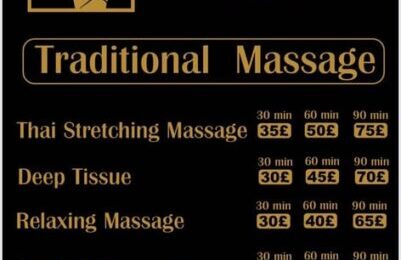 Thai massage 1hrs/£50 Hot oil/1hrs/�£40 Aroma 1hrs/£50 Swedish 1hrs/£50 Deep tissue1hrs/£45 Start from £30 We are in the center of Chester Just to Notice .We